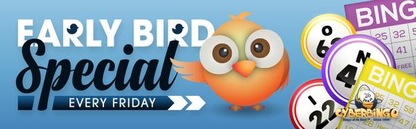 Tweet Tweet. Early bird catches... yummy cash prizes. Cash prizes up to $2,500! CyberBingo'sEarly Bird Bingo Special will quench your hunger for thrilling low-cost bingo action – with the juiciest of prizes.