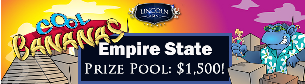 Win your portion from a prize pool of $1,500 when you play in the Empire State tournament at Lincoln Casino. This grand event features the five reel slot Cool Bananas. Win the big $700 first prize! The Empire State tournament runs
