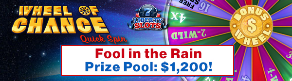 $1,200 in prizes is up for grabs! Enjoy April Fools with the Fool in the Rain tournament at Liberty Slots Casino. Play the Wheel of Chance Quick Spin in this event. The Fool in the Rain tournament concludes April 15th. The first prize is $600!