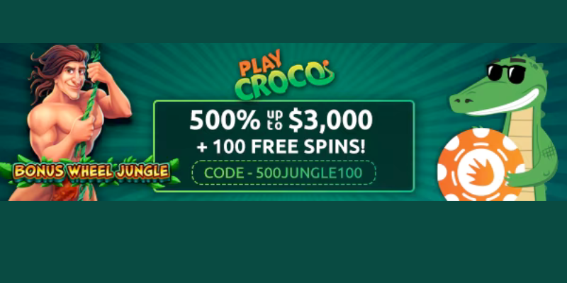 At PlayCroco Casino this week deposit and receive a whopping 500% up to $3,000 plus 100 spins. And you also receive 25 free spins on Bonus Wheel Jungle!