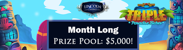 It's another sensational Month Long tournament at Lincoln Casino. The prize pool is $5,000! Play the five reel slot Triple Paradise Riches in this event which runs throughout August and ends on the 31st. The first prize is a huge