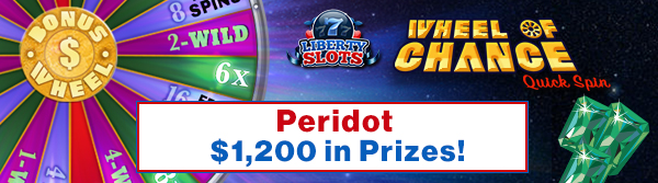 The Peridot tournament gets underway August 1st at Liberty Slots Casino. Win your share of $1,200 in prizes! This event features the very popular five reel slot Wheel of Chance Quick Spin. Play and win the first prize, $600!