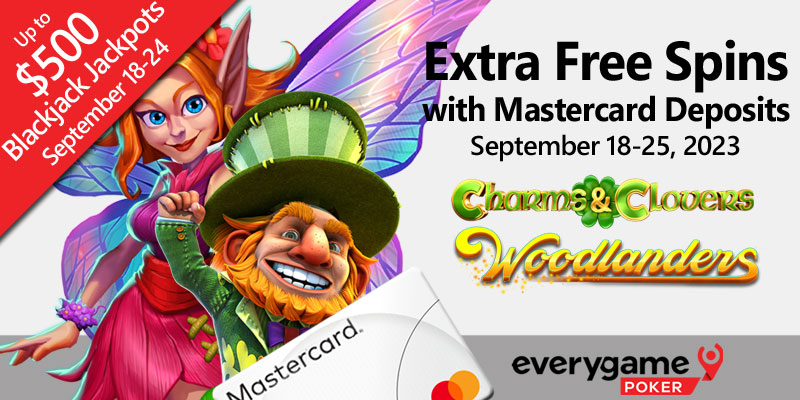 Treasures and Woodlanders. Players that deposit using Mastercard will get 30 EXTRA free spins. Also this week, Blackjack players can win up to $500 extra for winning hands.