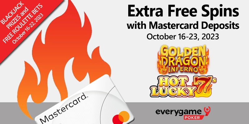 slots: Hot Lucky 7s and Golden Dragon Inferno. Those that deposit using Mastercard will get 30 EXTRA free spins. Also this week, Blackjack players can win up to $500 extra for winning hands and everyone can get free Roulette bets.