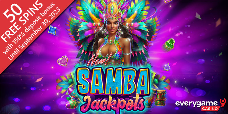 Samba Jackpots, a Mardi Gras themed game with ten jackpots (including a Quick Hit Jackpot), Wild Reels, and free spins with extra Wild Reels, is now available at Everygame Casino. Until September 30, players can claim an up to $5000 introductory deposit bonus that includes 50 free spins on this new game.
