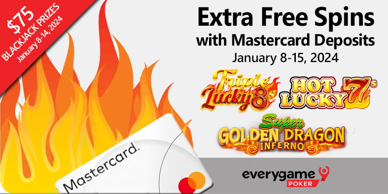 slots: Hot Lucky 7s, Triple Lucky 8s and Super Golden Dragon Inferno. Everyone that deposits using Mastercard will get 30 EXTRA free spins. Also this week, Blackjack players can win a $75 bonus prize.