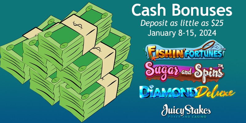 bonuses to play on three full-featured slots from Nucleus Gaming: Fishin’ Fortunes, Diamond Deluxe and Sugar and Spins. These instant cash bonuses are available with deposits made January 8-15.