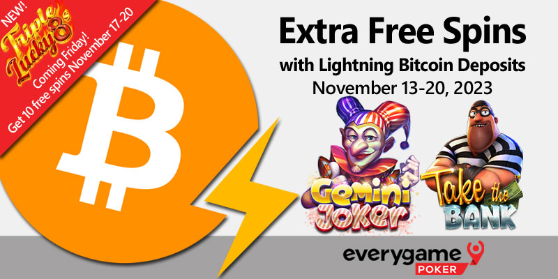 This week slots players at Everygame Poker can get free spins on two slots from Betsoft – and get 30 EXTRA free spins if they deposit with Lightning Bitcoin. Until Sunday they can also win a $75 cash bonus during the monthly Blackjack Quest. This weekend, everyone can
