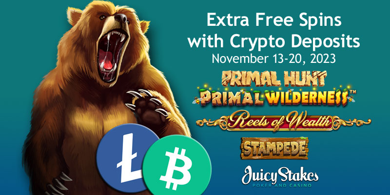 November 13 - 20. Players that deposit with Bitcoin Cash or LiteCoin will get 30 EXTRA free spins. The featured slots -- Reels of Wealth, Stampede, Primal Hunt and Primal Wilderness -- have wild wolves, wild lions, wild elephants and Multiplier Wilds.
