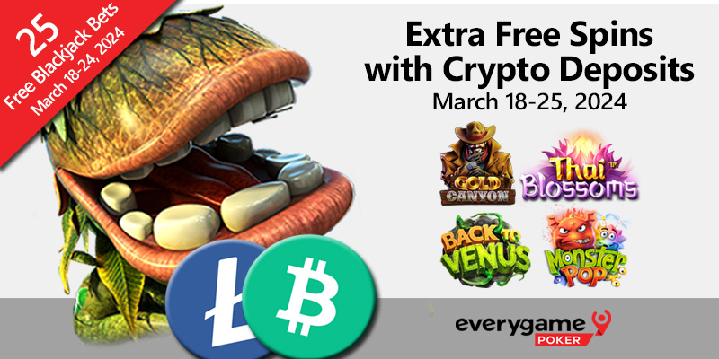 four player favorites from Betsoft: Back to Venus, Gold Canyon, Monster Pop and Thai Blossoms. Players that deposit with LiteCoin or Bitcoin Cash will get 20 EXTRA free spins.Â