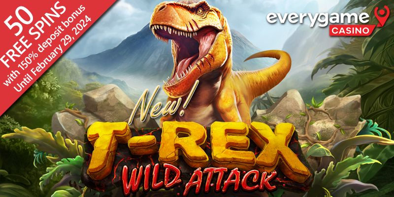 Everygame Casino has just introduced a ferocious new dinosaur-themed slot game. The new T-Rex Wild Attack is a 6X4 slot with an explosive Cascade feature, a Free Games feature with stacked Wilds that multiply wins up to 5X, and a Re-spin feature where the win multiplier increases with each non-winning spin. A 150% introductory deposit bonus that includes 50 free spins on the new game is available until February 29.Â