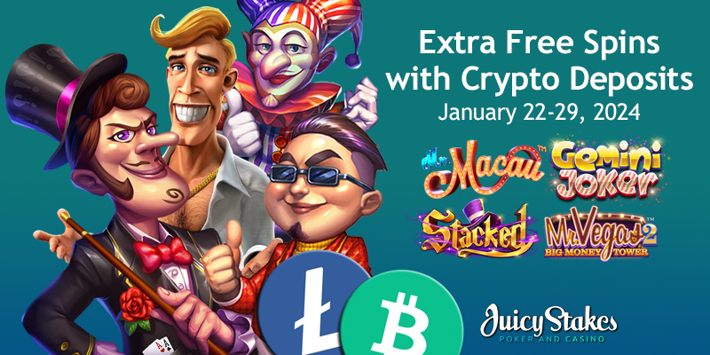 Juicy Stakes Casinois giving free spins on four popular slots from Betsoft this week: Stacked, Gemini Joke, Mr. Vegas 2 and Mr. Macau. January 22-29, players that deposit with LiteCoin or Bitcoin Cash will get 30 extra free spins.